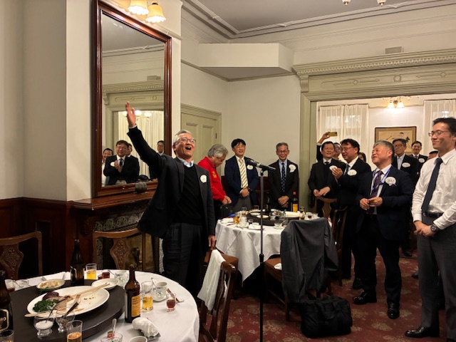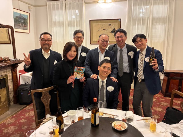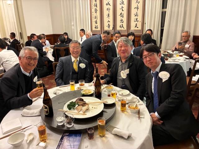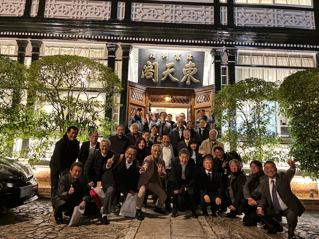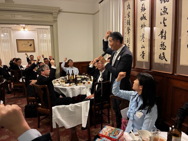 12月3日東天閣において西馬同窓会課長、篠坂校友課長列席のもと忘年会を開催。今秋「旭日双光賞」を受賞した有馬英一幹事長に記念の楯を贈呈し大いに盛り上がりました。 最後は恒例の酒井副支部長によるエールで「空の翼」を高らかに斉唱し散会した。